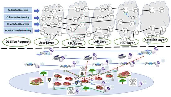 The IoV scenario considered is implemented through an integrated T/NTN equipped with edge computing platforms. Different networking nodes, such as Road Side Units (RSUs), Low-Altitude Platforms (LAPs), High-Altitude Platforms (HAPs), and Satellite nodes, are distributed throughout the service area. The system is able to take advantage of different DL methods to cope with the requirements of heterogeneous users. Since the scenario considered includes a massive amount of computation, communication, and storage resources distributed over the ground, air, and space networks, these resources can be utilized to create an intelligent VN through proper deployment of required DL methods, where each network device is able to host the virtual functions enabling the different DL execution. In such a system, a slice-based approach is considered, where each slice is a logical entity that enables the interconnection of different functions to build a specific DL method.