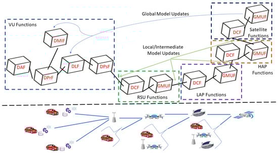 Figure 2 shows a more detailed view of the DLaaS concept, where the virtual learning functions of a single slice are reported. A multi-layer FL is considered representative, involving data collection and learning at the VU nodes, local/intermediate model updates collections and processing, i.e., averaging at the intermediate layers of RSUs, LAPs, HAPs, satellites, and model inference operation at VUs.