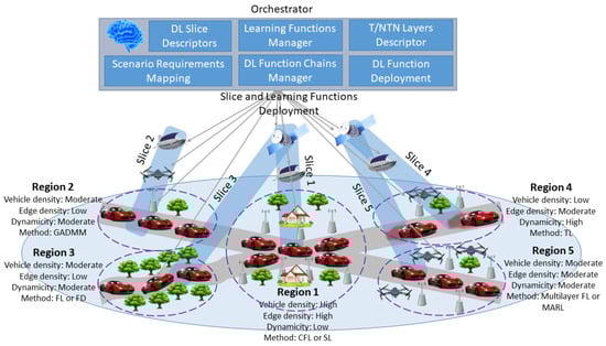 Different IoV parameters, such as VUs’ geographical positions, speed, edge node densities, application requirements, etc., can impact the VUs’ demands for one of the available DL slices. Here, in Figure 3, we consider a case study of realistic IoV scenarios with different slice demands. A centralized orchestrator/manager considers the scenario requirements where, thanks to specific DL slice descriptors, is able to deploy the Learning Functions to the different nodes. To this aim, proper descriptions of T/NTN layers are considered, where specific communications and computing capabilities are mapped. When assigning DL slices to the different VUs, they can be considered logically organized in clusters, where each cluster is characterized by specific applications, environmental conditions, and/or vehicular characteristics.