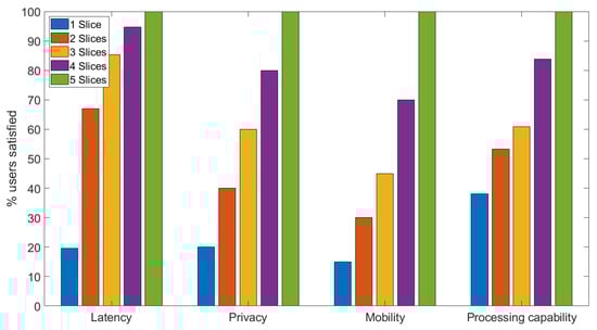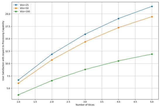 The insights derived from Figure 6 accentuate the positive impact of employing multiple slices on user satisfaction with the average processing capacity, especially in the presence of varying numbers of VUs. The figure manifests a clear trend in which the use of the slices contributes to a substantial improvement in the overall satisfaction of the VUs with respect to the processing capacity.