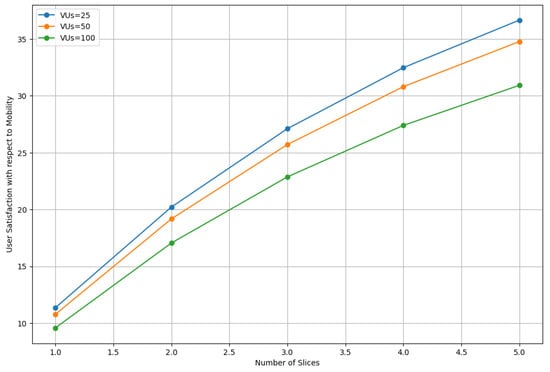 User satisfaction with respect to mobility versus the number of slices for different number of VUs.