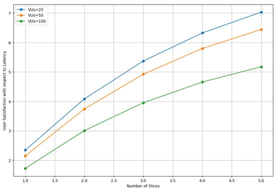User satisfaction with respect to average latency versus the number of slices for different number of VUs.