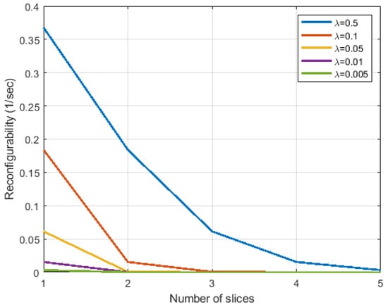 On the other hand, we would like to show how slicing can be beneficial in reducing the time required to respond to the varying tasks demanded by users. To achieve this, we assume that the probability density function (PDF) of the requested tasks is Poisson distributed with a parameter , which represents the average frequency of requests for each VU. The expected time value required for the slices to reconfigure to a new state for the requested services is reported, showing how much time is needed between consecutive requests to deploy a slice. Figure 8 shows this variable versus the number of slices for five different values of in requests per second. This figure leads us to conclude that the more slices, the lower the reconfiguration frequency, and five slices are enough for the reconfigurability to go to zero.