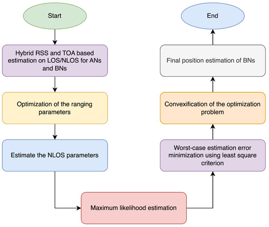 where and represent the transmit time and signal power, respectively, and are the non-negative NLOS biases in the RSS and TOA measurements, respectively. The terms is the noise in RSS measurements and are measurement noise in TOA measurements, respectively [66]. According to [47], the NLOS biases are assumed to be uniformly and randomly distributed with maximum bias such that , where .
