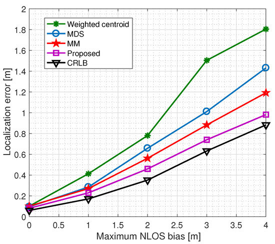 We performed simulations in MATLAB to assess the impact of the maximum NLOS bias, denoted as , on the algorithm’s performance compared to WCL, MDS, and MM, as illustrated in Figure 4. This analysis was carried out while maintaining constant values for other parameters and concurrently modifying . In the scenario where all communication links are NLOS, the parameter estimator method approximates an additional offset of . It is worth noting that this offset remains consistently applicable to all links, leading to a performance closely aligned with the parameter estimation process. Figure 4 also highlights the superior performance of the hybrid method compared to WCL, MDS, and MM-based localization techniques. The hybrid approach effectively mitigates the challenges of path-loss shadowing and the inherent uncertainties in RSS measurements. Specifically, our proposed cooperative scheme significantly outperforms the non-cooperative WCL, MDS, and MM schemes, achieving the CRLB.