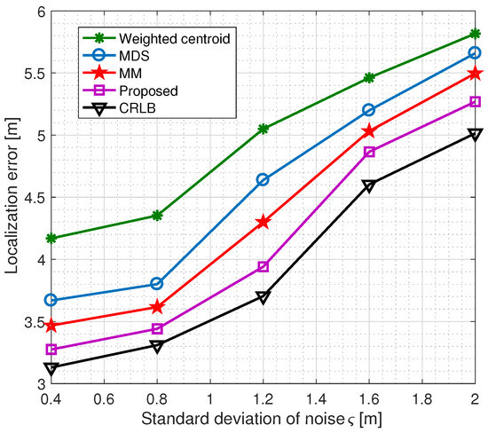 To gain further insight into the performance analysis of the proposed hybrid NLOS mitigation scheme compared to the WCL, MDS, and MM algorithm, we analyze the impact of measurement noise as given in Figure 5.