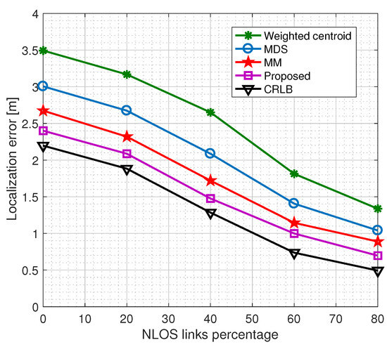 Next, we explore the impact of the network’s proportion of LOS and NLOS links. Figure 6 presents the performance analysis as we vary the percentage of NLOS links in the network, denoted as . We set the total number of LOS and NLOS links in the network as and , respectively. It’s worth noting that the existing algorithms strongly rely on the availability of a maximum number of LOS links, and their performance tends to decline with the increase in NLOS links.