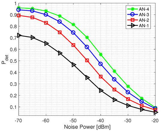 As depicted in Figure 8, the detection probabilities tend to be higher when the noise power is lower. Precisely, the 70% detection rate in the case of a single AN aligns with findings from previous works in [69]. However, what’s noteworthy is that the utilization of a fusion process involving multiple ANs results in a notable enhancement in the probability of detection across the entire range of noise power levels. This improvement attributed to fusion is most pronounced when transitioning from a single AN to two, providing a significant 27% increase. As we move into the low noise power saturation regime, the improvement diminishes but still yields a 2% gain when transitioning from three to four nodes.