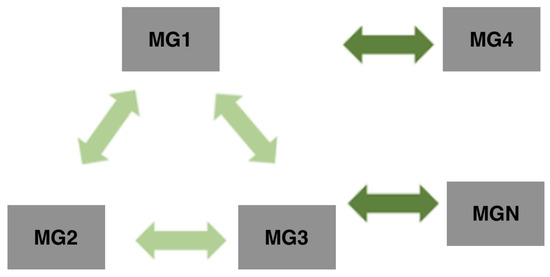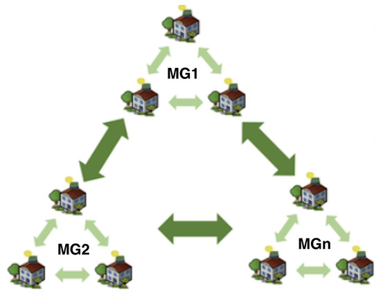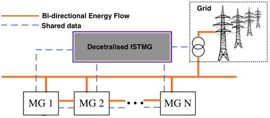 Thus, the objective of interconnecting STMs seamlessly (termed ISTMGs—interconnected smart transactive microgrids) is to unify and optimize existing isolated clusters of geographically close, independent MGs through the use of a shared distribution bus [14]. Such an integration aims to improve the stability, reliability, and overall performance of the broader electrical grid system. Furthermore, ISTMGs are required to enhance the efficiency of electricity usage via the generation, trading, sharing, and optimization of energy among users based on the use of distributed renewable energy (DRE) systems [15,16].