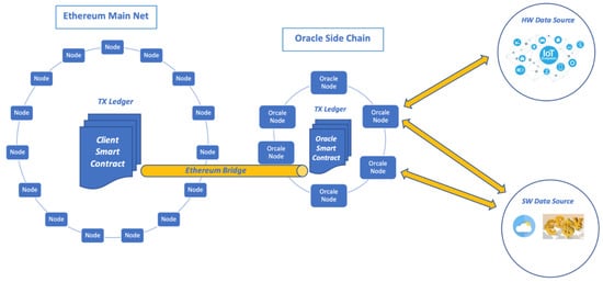 As previously mentioned in Section 2.1, the blockchain is a collection of blocks containing cryptographically chained transactions [,]. The only available data are those which are inherently available in the blockchain state, and we are only able to process information that exists in that state. This is a crucial property of any blockchain, by extension including the Ethereum blockchain. Blockchains are referred to as ‘Siloed’ in the sense that they are isolated from the outside world because the transactions in a block represent a mutation in only the existing internal state. In the case of Bitcoin, the transactions represent a change in the state of Bitcoin holdings every account has by registering the transfer of Bitcoin from one account to another. In the case of Ethereum, the transactions represent a change in the state of the EVM. It is ‘intrinsically deterministic’ because EVMs on different nodes must execute the same code with the same input and come up with the same conclusion, which modifies the blockchain state. That means there cannot be any source of ‘randomness’, which becomes very important as we state our design. To realize the full potential of smart contracts and for them to be used for real-world applications, they need to be able to interact with the outside world. They must consume, produce, and process data outside the blockchain [].