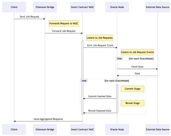 To that end, we propose Veritas, a layer-2-based decentralized oracle for Ethereum-based smart contracts. With Veritas, the Oracle nodes are part of a sidechain network based on the same consensus rules as Ethereum (proof of stake as of 2022) [,]; this achieves a high level of security and transparency desired for decentralized Oracle systems. All jobs and activities performed by the nodes are orchestrated by a central smart contract living on the Veritas sidechain; this includes processing jobs, assigning jobs, receiving and aggregating results, and penalizing dishonest Oracle nodes.