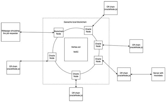 The ‘Veritas’ oracle network is a separate blockchain serving as a sidechain that is interoperable with Ethereum and uses the same exact consensus mechanism that Ethereum uses, meaning that the security protocols that enable robust and trustless operation on the main (layer-1) chain also apply to the side chain since it is a blockchain in its own right. A side chain operating in conjunction with a main chain is what is known as a layer-2 chain, as it represents a second layer in processing transactions. As mentioned in Section 2.2, Ethereum has recently undergone a transition to POS, which greatly improves efficiency and speed. Veritas is also POS-based, as POS guarantees faster transaction approval instead of the computationally intensive work required to approve a block using POW, and it is also better in terms of efficiency and power requirements. Each node in this side chain is a fully participating blockchain node with a node client communicating with it. Figure 1 illustrates the architecture and design of the system.