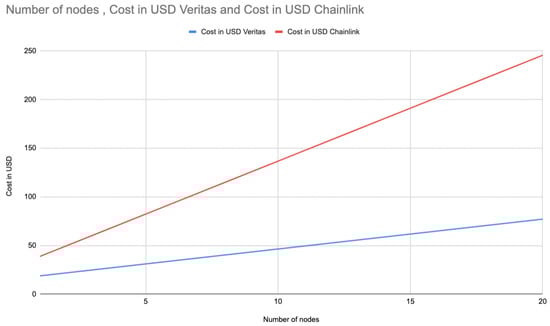 As per Equations (10)–(14), we answer RQ2, where it demonstrates the advantage Veritas has in terms of efficiency fulfilling real-time data fetching jobs. This is because the aggregation from the nodes on the side chain has a gas cost substantially lesser than that of the gas cost on Ethereum []. In addition, the number of data points sent back to the Ethereum main net is substantially lesser since the number of requests in the case of Veritas is multiplied by factor V which is a subset of the data points that deviate more than threshold , thereby greatly reducing the cost of the job.