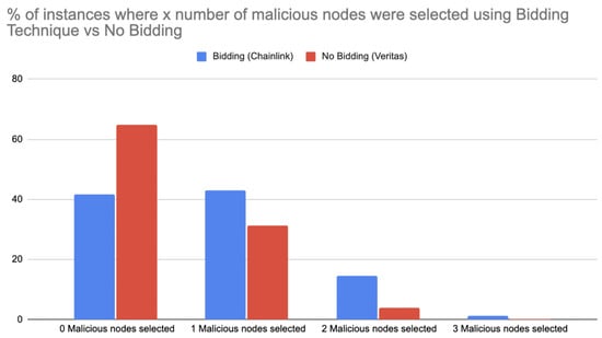 As can be seen, the bidding process allows for malicious nodes to underbid and increases the likelihood that they are selected to perform jobs, resulting in questionable information. On the contrary, the likelihood is lower for Veritas, where there is no such process.