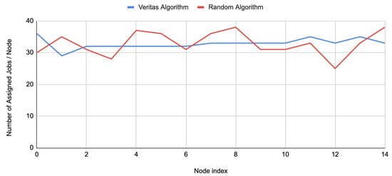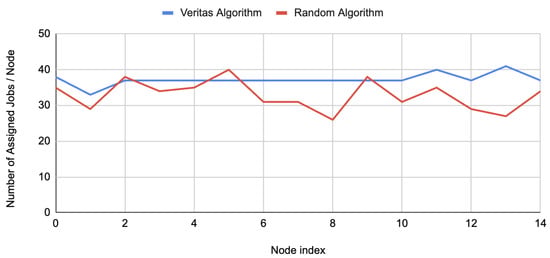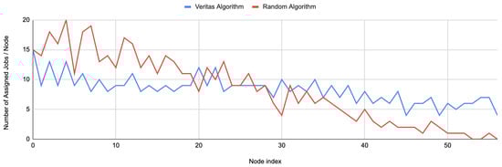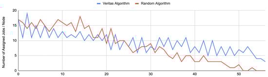 As can be seen from the variants in Figure 9 and Figure 10, the Veritas selection algorithm considers new joining nodes and assigns them jobs to make sure there is no huge gap in job distribution and offer recent nodes a chance to gain reputation and not cause a monopoly for older nodes in the system.