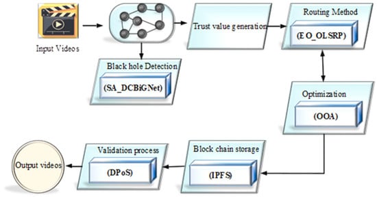 Accordingly, the proposed study introduces an effective extended the OLSR protocol with a deep-learning model for enabling effective video streaming in MANETs. The steps involved in the proposed study are data collection, black-hole detection with trust-based optimal reliable routing, blockchain storage, and validation. Initially, the input video data are gathered from publicly available sources. Then, for identifying black-hole nodes, the proposed study introduces a new twin-attention-based dense convolutional bidirectional gated network (SA_DCBiGNet) model. Then, a trust value is generated to analyze the reliability of neighboring nodes, based on the trust values. After, the routing is performed using the extended osprey-assisted optimized link state routing protocol (EO_OLSRP). Figure 1 shows the block diagram of the proposed method.