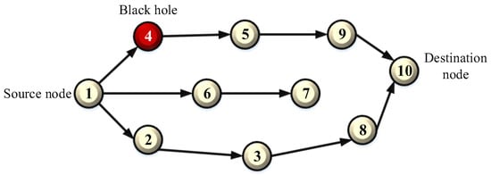 The malicious network participates in a variety of harmful acts that reduce the network’s efficiency []. Then, the malicious node transmits route response (RREP) information to the source node after the source node receives the route request (RREQ) most quickly to the node that is being attacked without considering the real route from the point of origin. The false route response is regularly transmitted to the source node by the blackhole station. When a malicious node maintains data packets before deleting the remainder of the network, then the network’s performance drops.