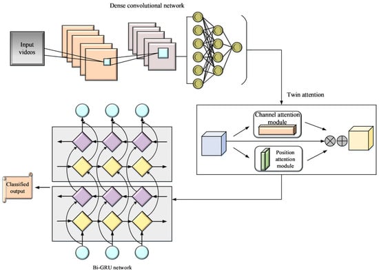 The proposed dense convolutional bidirectional gated network (SA_DCBiGNet) model is discussed in this section. The proposed SA_DCBiGNet method includes a dense convolutional neural network (Dense-CNN), twin attention, and Bi-GRU network. There are two kinds of twin attention: the position-attention and channel-attention methods. The proposed SA_DCBiGNet model is based on twin attention for locating black-hole nodes. Once the black-hole node is detected, videos received from the particular node are ignored. Table 1 depicts hyperparameters and values. Figure 4 shows the architecture of the SA_DCBiGNet model.