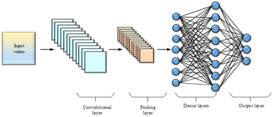 A dense network is used in various fields for numerous kinds of applications, including linear classification and analysis and unsupervised information clustering. It can analyze data with complex patterns. The proposed convolutional neural network (CNN) is a type of neural network that is comparable to a dense network because it is designed largely to analyze visual data. The result allows an encoding of video-specific details in the neural network construction, which makes it more suitable for tasks that require videos. A CNN’s straightforward and accurate design, shown in Figure 6, allows it to associate a sizable quantity of data recorded in a video into the final output.