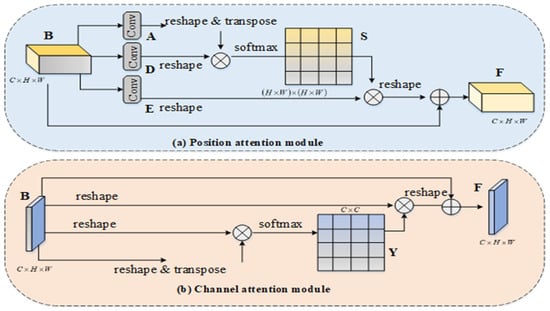 The proposed position-attention method consists of increasing a model’s capacity for local characteristics by encoding a larger variety of context-related data into each other. The method for adaptively aggregating spatial contexts is then elaborated. The local feature is represented as . The convolutional layer produces two features, and , where . Then, the dimensions are reshaped by . Hence, the number of pixels is denoted as . The spatial attention connected to softmax is then calculated by performing a matrix multiplication involving the transpose vectors and .