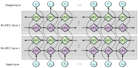 The proposed GRU network, improved by two layers of architecture, is referred to as a Bi-GRU network. The two-layer layout gives the output layer access to the input layers’ full context data at all times. The Bi-GRU network’s fundamental principle is that the input series is processed by two networks that are forward and backward networks, before their respective outputs are combined in a single output layer. The forward layer analyzes the output from the hidden layer in every step between forward and backward in a Bi-GRU network, then the backward layer computes the output from the hidden layer every time between backward and forward. At every stage, the output values from the forward and backward layers are combined and normalized by the output layer in Figure 8.