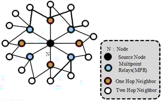 The proposed OLSR represents a proactive routing system that commonly exchanges network structure information from nodes [,]. Each node in the network chooses a set of neighboring nodes to serve as multipoint relays (MPR). The OLSR proposes to function independently of the network’s additional protocols. In addition, the connection between layers that exist from the OLSR is not used in any computation. It is utilized for groups of ad-hoc networks such as MANETs.