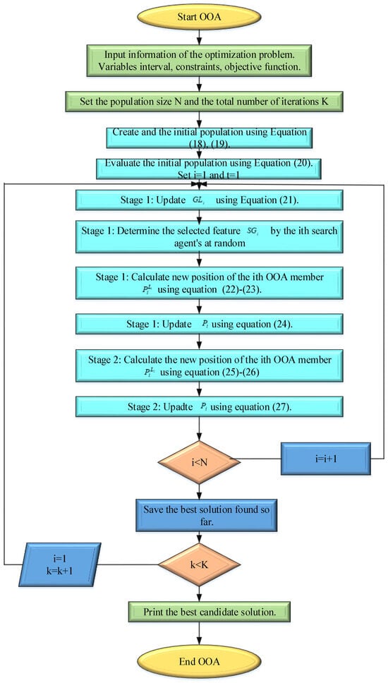 The OOA describes a population-based strategy that utilizes the benefit of the searching ability of population members in the area of problem-solving to identify a feasible solution over a replication-based approach. As an individual of the OOA population, every search agent determines the ranges of variables related to their specific location within the search region. Consequently, every search agent is a possible fix for the problem, represented statistically by a vector. All search agents comprise an OOA populace, which is given in Equation (17). When the OOA is initially applied, Equation (18) is used to initialize at random search agents’ locations in the search area.