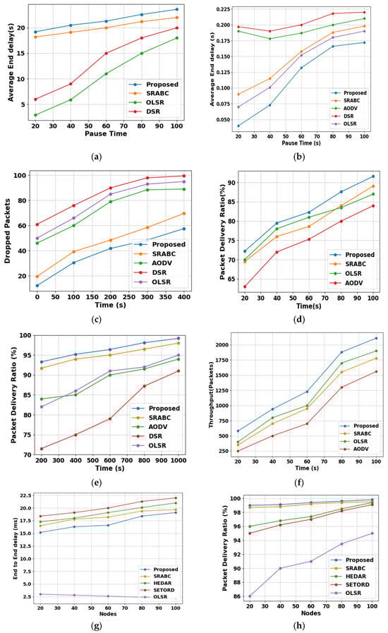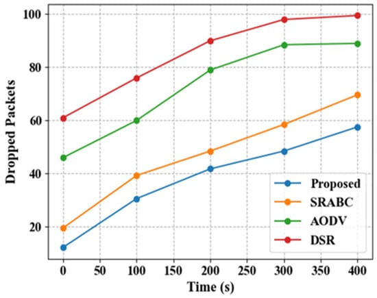 Figure 16 and Table 4 show the dropped packets of proposed and existing methods by varying time (s). At a time of 0 s, the proposed method achieves a number of dropped packets of 12.2, whereas for the existing SRABC, AODV, and DSR methods, the numbers of dropped packets are 19.5, 46 and 61, respectively. At a time of 100 s, the proposed method has 30.6 dropped packets, whereas the existing methods have 39.3, 60 and 76, respectively. At a time of 200 s, the proposed method has 41.8 dropped packets, whereas the existing methods have 48.5, 79, and 90, respectively. At a time of 300 s, the proposed method has 48.5 dropped packets, whereas the existing methods have 58.5, 88.5, and 98, respectively. At a time of 400 s, the proposed method has 57.6 dropped packets, whereas the existing methods have 69.7, 89, and 99.5, respectively. So, the generated graph proves that the recommended strategy achieves a very low packet drop ratio. At a time of 400 seconds, the existing SRABC method time is 69.7 s, which the proposed method improves to 12.1 s. At a time of 400 seconds, the existing AODV method time is 89 s, which the proposed method improves to 31.7 s. At a time of 400 seconds, the existing DSR method time is 99.5 s, which the proposed method improves to 41.9 s.