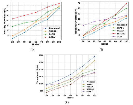 Figure 23 shows the routing overhead (%) of proposed and existing methods by varying nodes. For 20 nodes, the proposed method’s routing overhead is 5%, compared to the routing overheads of the existing SRABC, HEDAR, and SETORD methods, which are 8.7, 9, and 10%, respectively. For 40 nodes, the proposed method achieves a routing overhead of 14.6%, compared to existing methods’ routing overheads, which are 19, 27, and 22%, respectively. For 60 nodes, the proposed method achieves a routing overhead of 26%, compared to existing methods’ routing overheads, which are 29, 32, and 37%, respectively. For 80 nodes, the proposed method achieves a routing overhead of 30.4%, compared to existing methods’ routing overheads, which are 35, 47, and 48%, respec-tively. For 100 nodes, the proposed method achieves a routing overhead of 41.7%, compared to existing methods’ routing overheads, which are 45, 60, and 69%, respec-tively. So, the proposed method may permit routing to certain networks, and it in-creases security. For Node 100, the existing SRABC method node is 45, which the pro-posed method improves to 3.3. For Node 100, the existing HEDAR method node is 60, which the proposed method improves to 18.3. For Node 100, the existing SETORD method node is 69, which the proposed method improves to 27.3.
