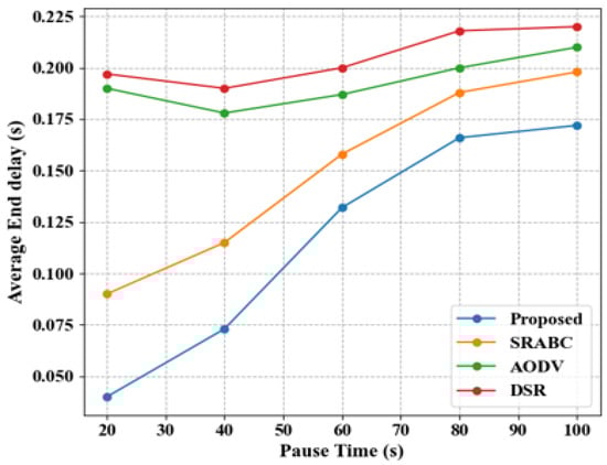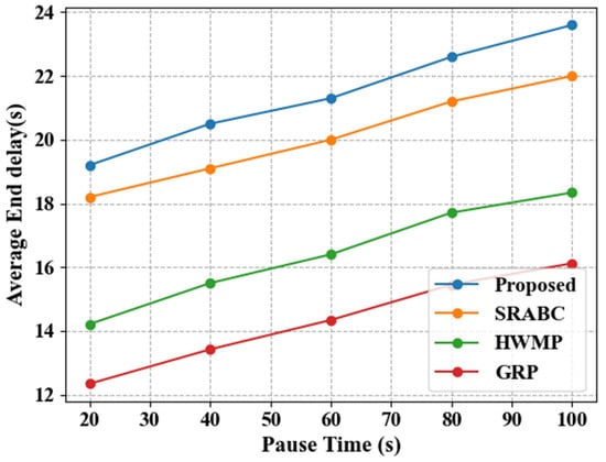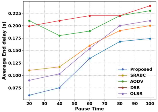 Average end delay(s) of the proposed and existing methods by varying pause time.