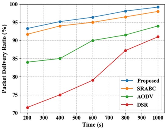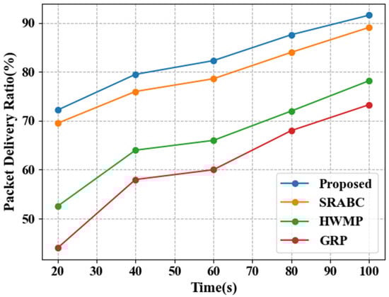 Packet-delivery ratio (%) of the proposed and existing methods by varying time.