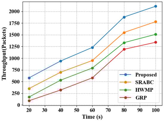 Figure 19 and Table 4 show the throughput (packets) of the proposed methods by varying time. At a time of 20 seconds, the proposed model achieves a throughput of 580, compared to the throughputs of the existing SRABC, HWMP, and GRP methods which are 350, 170, and 90, respectively. At a time of 40 seconds, the proposed model achieves a throughput of 940, compared to the throughputs of the existing methods, which are 700, 530, and 320, respectively. At a time of 60 seconds, the proposed model achieves a throughput of 1230, compared to the throughputs of the existing methods, which are 950, 790, and 580, respectively. At a time of 80 seconds, the proposed model achieves a throughput of 1880, compared to the throughputs of the existing methods, which are 1550, 1332, and 1190, respectively. At a time of 100 seconds, the proposed model achieves a throughput of 2110, compared to the throughputs of the existing methods, which are 1780, 1510, and 1340, respectively. So, the proposed method is to enable higher actual throughput while reducing total expenses for overhead.