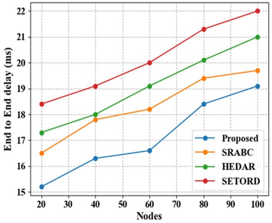 Figure 20 shows the end-to-end delay of the proposed and existing methods by varying nodes. For Node 20, the proposed method achieves an end-to-end delay of 15.2, compared to the end-to-end delays of the existing SRABC, HEDAR, and SETORD methods, which are 16.5, 17.3, and 18.4, respectively. For Node 40, the proposed method achieves an end-to end delay of 16.3, compared to the end-to-end delays of the existing methods, which are 17.8, 18, and 19.1, respectively. For Node 60, the proposed method achieves an end-to-end delay of 16.6, compared to the existing methods’ end-to-end delays, which are 18.2, 19.1, and 20, respectively. For Node 80, the proposed method achieves an end-to-end delay of 18.4, compared to the existing methods’ end-to-end delays, which are 19.4, 20.1, and 21.3, respectively. For Node 100, the pro-posed method achieves an end-to-end delay of 19.1, compared to existing methods’ end-to-end delays, which are 19.7, 21 and 22, respectively. The figure demonstrates that, in comparison to the preceding method, the end-to-end delay is insignificant. For Node 100, the existing SRABC method node is 19.7, which the proposed method im-proves to 0.6. For Node 100, the existing HEDAR method node is 21, which the pro-posed method improves to 1.9. For Node 100, the existing SETORD method node is 22, which the proposed method improves to 2.9.