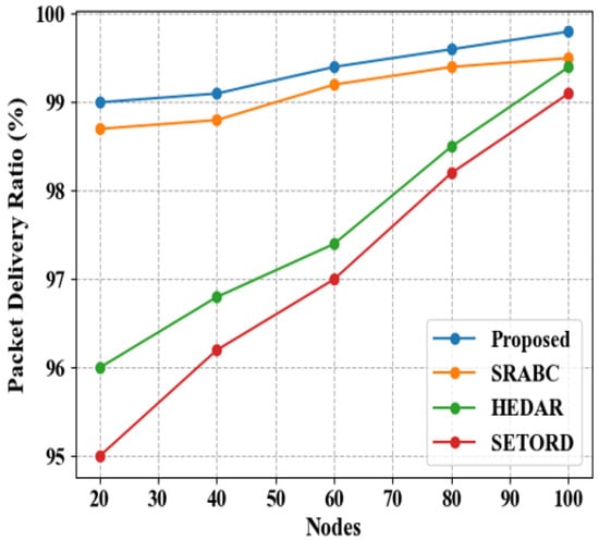 Figure 21 shows the packet-delivery ratio of proposed and existing methods by varying nodes. For Node 20, the proposed method achieves a packet-delivery ratio of 99, compared to existing SRABC, HEDAR, and SETORD methods’ packet-delivery ra-tios of 98.7, 96, and 95. For Node 40, the proposed method achieves a packet-delivery ratio of 99.1, compared to existing methods’ packet-delivery ratios, which are 98.8, 96.8, and 96.2, respectively. For Node 60, the proposed method achieves a pack-et-delivery ratio of 99.4, compared to existing methods’ packet-delivery ratios, which are 99.2, 97.4, and 97, respectively. For Node 80, the proposed method achieves a pack-et-delivery ratio of 99.6, compared to existing methods’ packet-delivery ratios, which are 99.4, 98.5, and 98.2, respectively. For Node 100, the proposed method achieves a packet-delivery ratio of 99.8, compared to existing methods’ packet-delivery ratios of 99.5, 99.4, and 99.1, respectively. So, the proposed method produces better results than other methods. For Node 100, the existing SRABC method node is 99.5, which the pro-posed method improves to 0.3. For Node 100, the existing HEDAR method node is 99.4, which the proposed method improves to 0.4. For Node 100, the existing SETORD method node is 99.1, which the proposed method improves to 0.7.