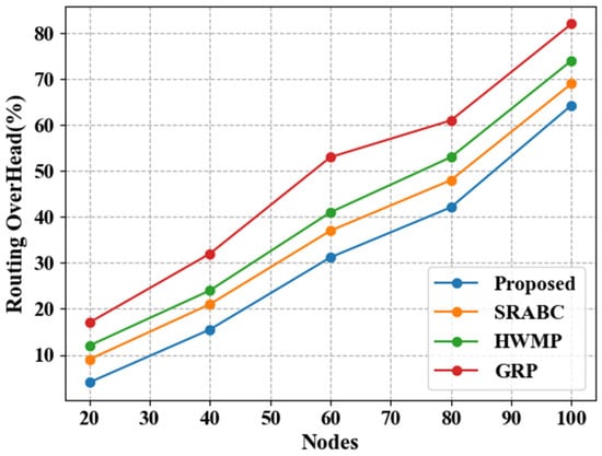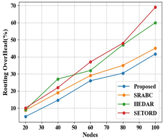 Routing overhead (%) of the proposed and existing methods by varying nodes.