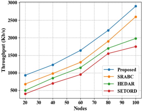 Figure 25 shows the throughput (Kb/s) of the proposed and existing methods by varying nodes. For 20 nodes, the throughput of the proposed method is 930, whereas the throughputs of the existing SRABC, HEDAR, and SETORD methods are 680, 500, and 400, respectively. For 40 nodes, the proposed method’s throughput is 1230, where-as the existing methods’ throughputs are 980, 850, and 700, respectively. For 60 nodes, the proposed method’s throughput is 1640, whereas the existing methods’ throughputs are 1300, 1150, and 950, respectively. For 80 nodes, the proposed method’s throughput is 2210, whereas the existing methods’ throughputs are 1900, 1700, and 1550, respec-tively. For 100 nodes, the proposed method’s throughput is 2900, whereas the existing methods’ throughputs are 2600, 1980, and 1750, respectively. Thus, the proposed method improves throughput compared to the preceding methods. Table 6 shows the analyzing nodes of the proposed and existing methods. For Node 100, the existing SRABC method node is 2600, which the proposed method improves to 300. For Node 100, the existing HEDAR method node is 1980, which the proposed method improves to 920. For Node 100, the existing SETORD method node is 99.1, which the proposed method improves to 0.7.