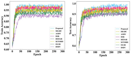 Figure 26 shows the training and testing accuracy of the proposed and existing methods for different epoch values. In the training stage, the accuracy of the proposed method increases up to 50 epochs and after the 50th epoch, there is a sudden rise in accuracy up to the 100th iteration, and after that, a rise to the 150th epoch. After an epoch value of 200, and from 250 and 300, the training accuracy remains constant for the proposed methods. Also, during testing accuracy level, after the 50th epoch there is a gradual rise in accuracy up to the 100th epoch, and after that, a sudden rise up to 200 epochs. After an epoch value of 200, and from 250 and 300, the testing accuracy re-mains constant for the proposed methods. Therefore, the proposed approach is effec-tive as, with an increase in repetitions, accuracy likewise rises to produce better out-comes.