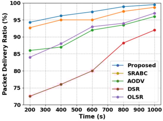 Figure 17 and Table 4 show the packet-delivery ratio (%) of the proposed methods by varying time. At a time of 20 seconds, the packet-delivery ratio of the proposed method is 72.2%, whereas the packet-delivery ratios of the existing SRABC and HWMP methods are 69.5% and 52.54%, respectively. At a time of 40 seconds, the pack-et-delivery ratio for the proposed method is 79.5%, whereas for the existing methods, it is 76%, 64%, and 58%, respectively. At a time of 60, the packet-delivery ratio for the proposed method is 82.3%, whereas for the existing methods, it is 78.6%, 66%, and 60%, respectively. At a time of 80 seconds, the packet-delivery ratio for the proposed method is 87.6%, whereas for the existing methods, it is 84%, 72%, and 68%, respectively. At a time of 100, the packet-delivery ratio for the proposed method is 91.6%, whereas for the existing methods, it is 89.1%, 78.2%, and 73.3%, respectively. The graph clearly in-dicates that the proposed method’s packet-delivery ratio obtains the maximum value compared to the prior techniques. Figure 18 and Table 4 show the packet-delivery ratio (%) of the proposed and existing methods by varying time. At a time of 200 seconds, the packet-delivery ratio of the proposed method is 93.3%, whereas for the existing SRABC, AODV, and DSR methods, it is 91.7, 84 and 71.5%, respectively. At a time of 400 seconds, the packet-delivery ratio for the proposed method is 95.2%, whereas for the existing methods, it is 94%, 85%, and 75%, respectively. At a time of 600 seconds, the packet-delivery ratio for the proposed method is 96.4%, whereas for the existing methods, it is 95%, 90%, and 79%, respectively. At a time of 800 seconds, the pack-et-delivery ratio for the proposed method is 98.1%, whereas for the existing methods, it is 96.5%, 91.5%, and 87.2%, respectively. At a time of 1000 seconds, the packet-delivery ratio for the proposed method is 99.1%, whereas for the existing methods, it is 98%, 94%, and 91%, respectively. So, the proposed method delivers a higher packet ratio when compared to other approaches. At a time of 1000 seconds, the existing SRABC method time is 98 s, which the proposed method improves to 1.2 s. At a time of 1000 seconds, the existing AODV method time is 94 s, which the proposed method improves to 5.2 s. At a time of 1000 seconds, the existing DSR method time is 91 s, which the proposed method improves to 8.2 s.