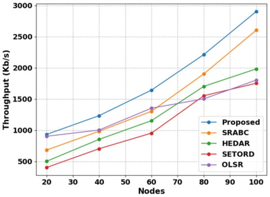 Throughput (Kb/s) of the proposed and existing methods by varying nodes.