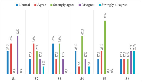 Figure 4 reveal insightful perspectives regarding participants’ perceptions of various aspects related to gesture interaction. A significant 42% found gesturing in the air cumbersome, highlighting potential usability challenges associated with this mode of interaction (S1). With respect to the syntax itself, a notable majority, comprising 58% of participants (S2), expressed agreement with the idea that the syntax associated with gesture commands was easy to learn. Conversely, only 17% of respondents voiced concerns regarding the effectiveness of this syntax when commanding the environment, suggesting a generally positive reception of the syntax’s utility (S3). With respect to technology-related implementation issues, the study findings indicate a clear acceptance of gesture chains with intermediate feedback, as evidenced by 75% of participants finding this approach acceptable (S4). The data also reveal a strong preference for location-awareness functionality, with 83% of participants expressing high appreciation for this feature (S5). This underscores the importance of context-aware interactions in augmenting user experience. Interestingly, half of the participants indicated a willingness to bypass confirmation steps upon completing gesture sequences (S6).