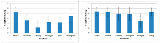 The statistical analysis utilising the Friedman test revealed significant variations in social acceptability ratings across different settings (χ2(2) = 40.317, p < 0.0005) and among various audiences (χ2(2) = 34.254, p < 0.0005). In terms of settings, the social acceptability score in a home environment significantly differed from all other settings, except for the workplace. Additionally, a notable distinction was observed between the acceptability scores while driving and being in a workplace setting. Concerning audiences, the social acceptability score significantly differed when the audience comprised strangers when compared to situations involving a partner, family members, or performing gestures alone.
