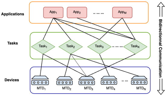 To analyze the execution of recurring MTC applications, one of the main types of massive access, we propose a graph-based model representing the relation between three key entities, applications, tasks, and devices, as shown in Figure 1. Applications, tasks, and devices are linked to the encapsulated underlying network components. Let , , and denote a set of applications, a set of tasks, and a set of devices, respectively. For example, in Figure 1, Application 1 executes Task 3, which requires reactions from Device 2 and N to be performed.