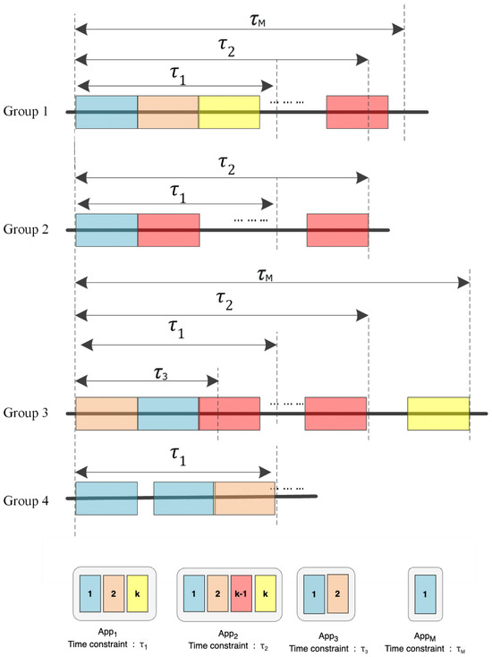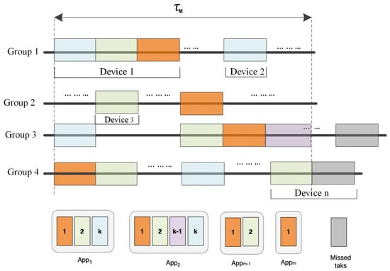 The problem was further relaxed and presented as a mixed integer linear programming problem (MILP) by converting the time constraints from applications to group points of view. We define the row vector as the i-th row of , indicating devices in a group i. Referring to Figure 2, from a group point of view, tasks can be scheduled to run consecutively, and the waiting time is therefore eliminated when saturated. If we replace the application-dependent time constraint with a group-specific , the constraint becomes fixed and linear. The relaxed group-based condition is