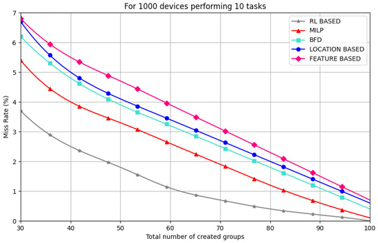 It is shown in Figure 6 that the RL-based model outperforms the other models with a less than miss rate in the worst-case scenario, where we have fewer groups and more “in-group” devices. Both MILP and BFD outperform the feature-based and location-based models. As the paper targets a massive MTC scenario, the RL-based model shows that scalability is needed to group devices. The primary goal is to reduce the number of groups created and guarantee punctual transmission for devices with a miss rate margin of 4%, which is affordable for delay-tolerant devices.