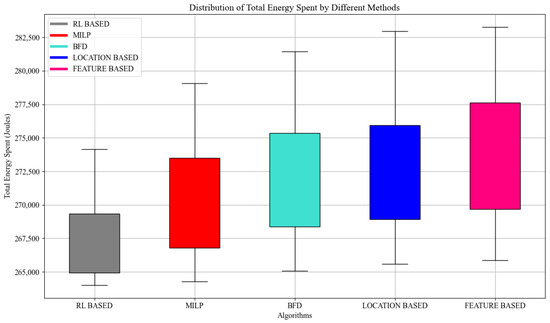 In this subsection, it is essential to consider energy consumption because the mMTC devices are mainly powered by batteries. Hence, we analyze the impact of collisions on the energy consumed by the devices. We consider the total energy consumed for a two-step RACH mechanism as 264 J []. Without loss of generality, we run the simulations for 1000 devices performing 10 tasks. As observed in Figure 7, when the collision rate is high, the energy consumption increases exponentially. The increase is the consequence of collision because the collided devices need to re-transmit with no guarantee of success in the following attempts. We can also observe that the RL-based model offers better energy efficiency than other grouping mechanisms, mainly because we took advantage of the devices’ and applications’ specific completion time constraints to implement an optimized scheduling mechanism. Hence, the flow ratio of attempts can be relaxed over time while guaranteeing that those with low latency requirements can be prioritized, improving the QoS.