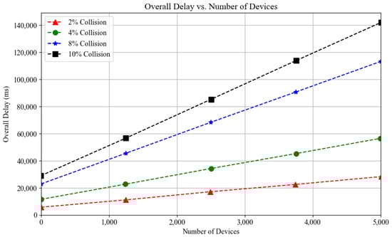 The transmission delay is the average time for successful data packet reception. As for the energy consumption, Figure 8 shows the access delays as the traffic load increases exponentially as the collision percentage increases from 2% to 10%. Every time a device fails the RACH due to collisions, it enters the waiting period set by the back-off timer while new devices keep arriving. Consequently, collided devices in the back-off mode are joined by new devices, further increasing the congestion. As a result, more devices will be forced to enter the back-off mode, increasing the delay.