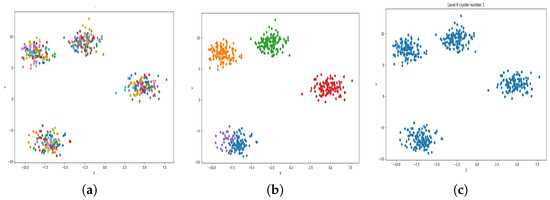 Result of clustering dataset (1000) in 3 dimensions with 4 clusters (Each cluster has a different color). (a) Level 1; (b) level 4; (c) level 6.