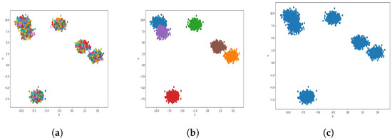 Result of clustering dataset (40,000) in 2 dimensions with 6 clusters (Each cluster has a different color). (a) Level 1; (b) level 4; (c) level 6.