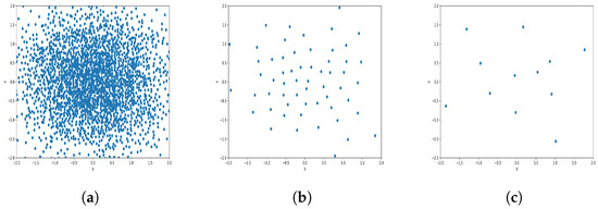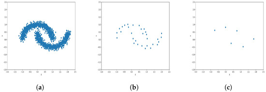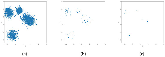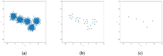 The results observed in the figures reveal that, as the level of consolidation increases, the number of data points decreases while maintaining the shape and overall distribution of the elements. In level 6, as depicted in Figure 8c, Figure 9c, Figure 10c, Figure 11c, Figure 12c and Figure 13c, there are notably fewer points compared to the original dataset’s size. However, the general shape of the distribution remains discernible. Consequently, the resultant data points from different levels can effectively represent the entire dataset and be utilized in various applications, yielding results that closely resemble those obtained using the complete dataset.