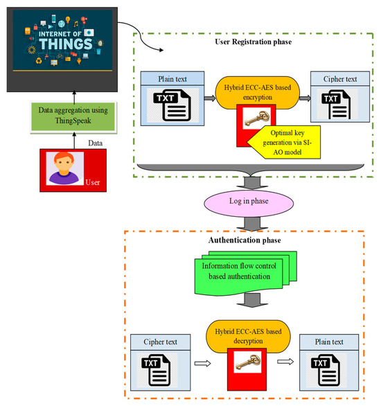 - Finally, decryption is accomplished using a hybrid ECC–AES model. Figure 1 shows the overall depiction of the suggested SI-AO-oriented model.